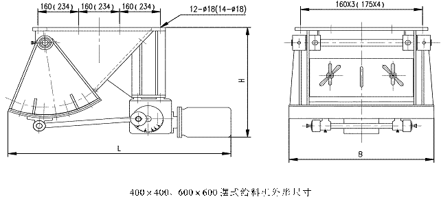 型號 | 進料口 L×M(mm) | 偏心輪行程 (mm) | 擺動次數(shù) (次/分) | zui大給料粒度 (mm) | 外形 | 生產率 t/h | 電動機 | 重量kg | ||||