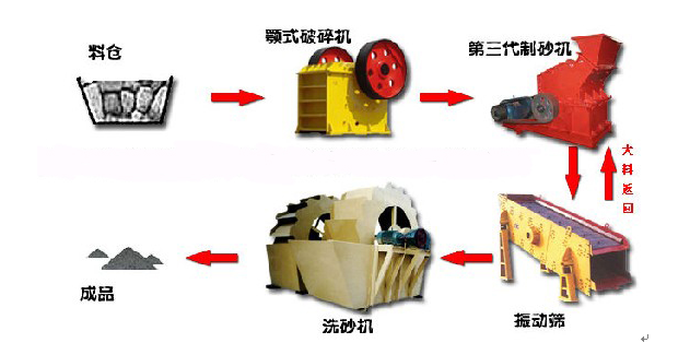 機制砂石設備基本流程:先石料由粗碎機進行初步破碎,然后,產成的粗料由膠帶輸送機輸送至細碎機進行進一步破碎,細碎后的石料進振動篩篩分出兩種石子,滿足制砂機進料粒度的石子進制砂機制砂,另一部分返料進細破。進制砂機的石子一部分制成砂,經洗砂機(可選)清洗后制成成品砂,另一部分進制砂機再次破碎。